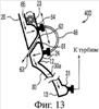 Как показано на фиг.12, коллектор 52 предусмотрен вдоль внешней окружности сопла 20 первого каскада (или точки 12 перегиба). Коллектор 52 имеет форму тороида. Блок 40С подачи газа включает в себя входное отверстие 55, предусмотренное на внутренней поверхности стенки сопла 30 второго каскада, и канал 53 подачи, соединяющий коллектор 52 и входное отверстие 55. Канал 53 подачи включает в себя сужающийся участок 54, площадь поперечного сечения протока которого уменьшается в направлении входного отверстия 55. Выхлопной газ турбины, после протекания его в коллекторе 52, нагнетают в пространство 80 из входного отверстия 55 через канал 53 подачи. Выхлопной газ турбины ускоряется, когда его пропускают через сужающий участок 54. Входное отверстие 55 нагнетает выхлопной газ турбины в виде потока в форме пленки вдоль внутренней поверхности стенки сопла 30 второго каскада в направлении к выходу 13 из сопла.