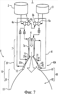 Турбонасос 4 для топлива подает топливо также в коллектор 21 из топливного бака 2. Топливо попадает в коллектор 22 из коллектора 21 после его протекания через контур 20а охлаждения и контур 7а охлаждения в упомянутом порядке. Топливо поступает в коллектор 23 через канал 20b охлаждения из коллектора 22, и его подают в турбонасос 4 для топлива из коллектора 23. Топливо выполняет привод турбонасоса 4 для топлива и турбонасоса 5 для окислителя. Выхлопной газ турбины в виде топлива, после привода турбонасоса 4 для топлива и турбонасоса 5 для окислителя, протекает в коллектор 42 через трубу 41. Блок 40А подачи газа подает выхлопной газ турбины в пространство 80 для управления потоком газообразных продуктов сгорания.