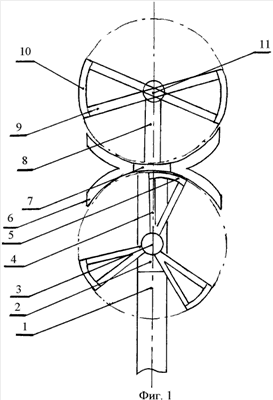 Это обеспечивается за счет того, что в ветроэлектрогенераторе, содержащем роторы-ветроколеса с сегментными элементами, статорные сегментные элементы, поворотное основание с хвостом, башню, согласно изобретению, поворотное основание снабжено вертикально ориентированными штангами с подшипниковыми узлами, причем в верхней штанге установлено быстроходное ветроколесо, в нижней штанге – тихоходное ветроколесо, а между ветроколесами установлены статорные сегментные элементы.