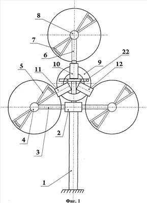 Статор работает следующим образом: при вращении ветроколес роторные элементы 18 с зубцами 17, установленные на лопастях ветроколес 5, 7, периодически входят в магнитный контакт каждый со своим магнитопроводом, а именно зубцы 17 со вторыми сторонами 16, 20 наконечников. В результате в катушке 9, примыкающей к источнику возбуждения, наводится ЭДС, которая дальше передается потребителю.