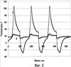 В качестве примера реализации изобретения на Фиг.5 приведены экспериментальные кривые изменения температуры газа в газовом резервуаре при рекуперации энергии для двух аккумуляторов Hydac типа SK350-2/2212A6 объемом 2 л, один из которых без регенератора (кривая 1), а второй (кривая 2) с регенератором в виде многослойной листовой пружины из 120 плоских листовых элементов толщиной 0,4 мм с секторными прокладками толщиной 1 мм между ними, как на Фиг.4. При этом ненапряженное состояние плоских листовых элементов соответствует максимальному объему газового резервуара. Температура окружающей среды 18°С. Начальное давление газа в обоих аккумуляторах 7 МПа. Каждый цикл состоит из 4 тактов: нагнетания жидкости в аккумулятор до давления 21 МПа в течение 20 с, хранения запасенной энергии в течение 50-60 с, вытеснения жидкости из аккумулятора до исходного давления 7 МПа в течение 30 с и паузы в течение 50 с. В аккумуляторе без регенератора газ нагревается при сжатии до 106°С, остывает за время хранения до 30-32°С, охлаждается при расширении до -30°С и нагревается за время паузы до 10-12°С. В то же время, в аккумуляторе с регенератором газ при сжатии нагревается не более чем до 25°С, а при расширении охлаждается не сильнее чем до 12°С. Таким образом, регенератор на порядок уменьшает степень нагрева газа при сжатии и охлаждения при расширении, соответственно уменьшая и потери запасенной энергии во время хранения. При любой степени сжатия газа в указанном диапазоне изменений давления относительная деформация листовых элементов (прогиб менее 1 мм при длине изгибаемых участков порядка 12 мм) существенно меньше предела упругости.