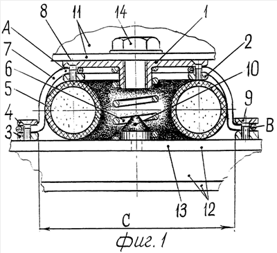 На фиг.1, 2 обозначены: 11 – виброизолируемый объект; 12 – фундамент или рама; 13 – полка фундамента; 14 – средство крепления опоры объекта к верхним опорным элементам 1, 2; 15 – отверстия для средств крепления нижнего опорного элемента к фундаменту; А, В – петли на опорных элементах 1, 2 и 3, 4; С – центральное отверстие на нижних опорных элементах 3, 4.