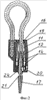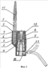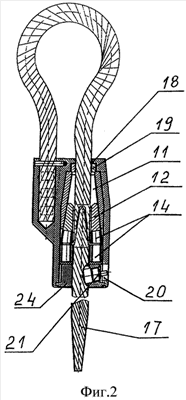 На чертежах изображено гибкое запорно-пломбировочное устройство, которое включает отрезок троса 1, один конец 2 которого предварительно установлен в ложементе 3 и обжат в корпусе 4. В отверстие 5 в боковой поверхности корпуса 6 через зафиксированный отрезок троса 2 запрессована шпилька 7, изготовленная из термообработанной стали. Корпус 4 выполнен с внутренней конической поверхностью 8, внутри которой расположена цельная металлическая обойма 9 со сквозным отверстием 10. Обойма 9 имеет посадочные места 11, предназначенные для размещения съемных клиньев 12. В корпусе 4 расположен сепаратор 13 с пружинами 14 с возможностью подпружинивания клиньев 12 в посадочных местах 11 обоймы 9. Обойма 9 и сепаратор 13 выполнены съемными, причем сепаратор 13 выполнен многоступенчатым с двумя выступами 15, а обойма 9 имеет пазы 16, соответствующие выступам 15 сепаратора для взаимной фиксации. Второй свободный конец троса 17 при запирании пропускается с образованием петли через ступенчатое отверстие 18, в котором свободно расположена опирающаяся на обойму 9 звездочка 19, и фиксируется в обойме 9 посредством двух клиньев 12. Корпус 4 имеет отверстие 20 для дополнительного фиксатора 21 троса, выполненного в виде винта со сферической головкой 22 и кольцевой проточкой 23 в зоне отламывания. Отверстие 20 расположено под углом 10 градусов к боковой поверхности корпуса. Корпус снабжен крышкой 24, неразъемно скрепляемой с ним. Информация наносится на сам корпус 4 без бирок носителей информации.