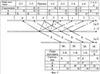 На фиг.2 изображена лучевая диаграмма КП 8R4 с таблицами положений сцеплений и муфт переключения на различных передачах. На горизонтальных шкалах диаграммы в логарифмическом виде представлены величины передаточных чисел пар шестерен и передач. Над верхней горизонталью обозначены номера передач переднего хода (8-1), под нижней горизонталью – передачи заднего хода (4R-1R). На крайних горизонталях величина передаточных чисел приведена к вторичному валу, на средней горизонтали – к промежуточному валу. Номера пар шестерен указаны на лучах. Наклон луча вправо указывает на замедляющий режим работы пары шестерен, чем положе луч, тем больше передаточное число. Наклон луча налево характеризует ускоряющий режим работы пары шестерен. Наклон луча каждой пары шестерен постоянный на любом участке лучевой диаграммы.