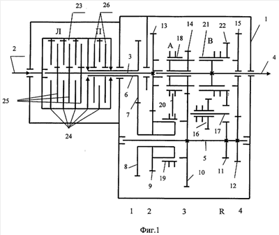 В опорах корпуса КП 1 соосно расположены входной 2, первичный 3 и вторичный 4 валы. Промежуточный вал 5 расположен параллельно валам 2-4. На первичном валу 3 установлен трубчатый вал 6, на нем закреплена шестерня 7, которая взаимозацеплена с шестерней 8. Блок шестерен 8-9 свободно установлен на промежуточном валу 5. Шестерни 10-12 жестко закреплены на промежуточном валу 5, шестерни 9, 10, 12 взаимозацеплены с шестернями 13-15. Шестерня 13 закреплена на первичном валу 3, а шестерни 14 и 15 свободно установлены на вторичном валу 4. Отдельная шестерня заднего хода 16 установлена на оси 17, которая расположена между промежуточным 5 и вторичным 4 валами. Сдвоенная муфта А состоит из двух полумуфт 18 и 19, взаимосвязанных вилкой переключения 20. Полумуфта 18 установлена на венце шестерни 14 вторичного вала 4, а полумуфта 19 – на венце шестерни 9 промежуточного вала 5 напротив полумуфты 18. Трехпозиционная муфта 21 (В) расположена между третьим и четвертым рядами шестерен на вторичном валу 4, на ней закреплена ведомая шестерня заднего хода 22.