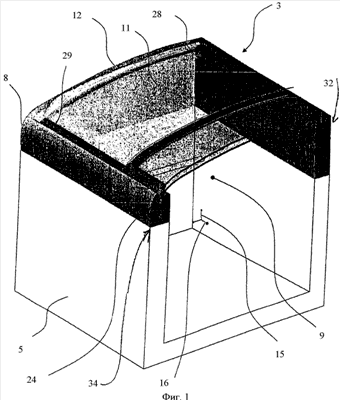 Далее со ссылкой на фиг.1-10 описан вариант выполнения, в котором контейнер 5 в виде морозильной камеры закрывается при помощи комплекта, включающего две стеклянные, почти горизонтальные фронтальные панели 11 крышки. Устройство для закрывания в целом обозначено номером 3 позиции. Номер 5 позиции используется в дальнейшем для обозначения контейнера, а также морозильной камеры. Кроме того, номер 11 позиции также используется для обозначения фронтальных панелей крышки, взятых как по отдельности, так и совместно, поскольку в представленном варианте выполнения фронтальные панели 11 крышки представляют собой одинаковые части, составленные в пары в зеркальном отражении.