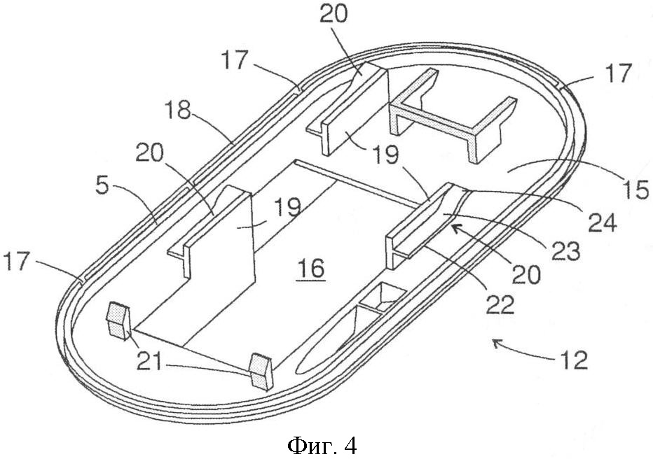 Базирующий элемент 12 имеет слегка вогнутое в сторону внутренней стенки 13 (или, соответственно, в перспективе фиг.4 – вверх) днище 15, в средней части которого образовано углубление 16 для размещения осветительного прибора. К внешней кромке днища 15 приформован упругий по всему периметру фартук 5 аналогично фиг.2 или фиг.3, который предусмотрен с тем, чтобы плотно прилегать к стороне пенопласта внутренней стенки, когда на ней зафиксирован базирующий элемент 12. Снаружи фартук 5 окружен ограждением 18, которое нераздельно соединено с днищем 15 посредством перемычек 17 и задерживает часть приходящегося на фартук 5 давления, возникающего при вспенивании пенопласта.