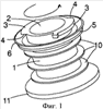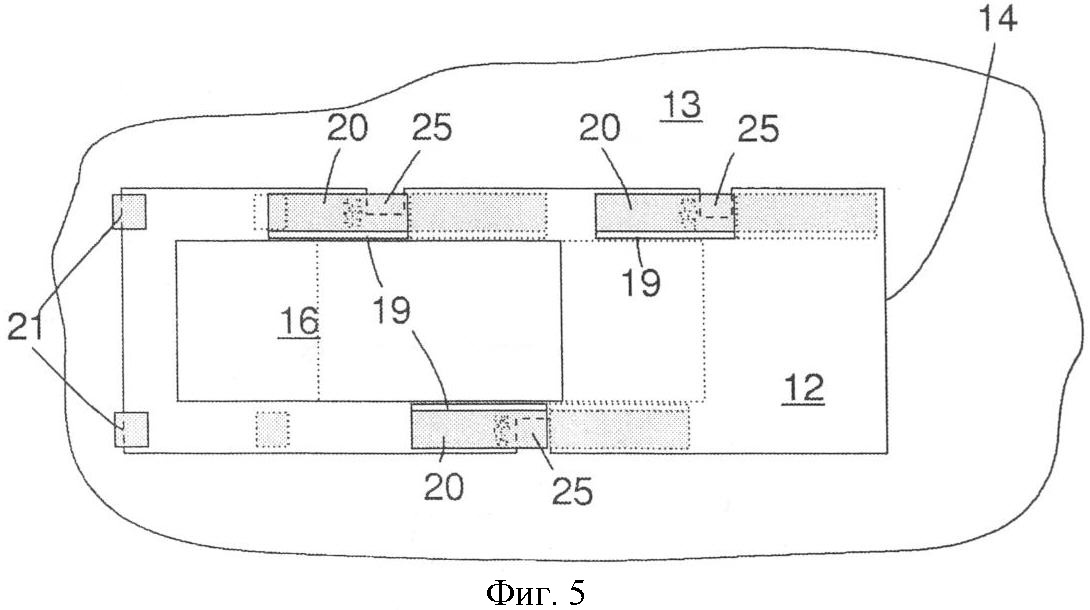 От днища 15 отстоят три параллельных ребра 19, каждое из которых содержит по одной перекинутой перемычке 20, а также два зацепа 21. Каждая из перемычек 20 имеет по два почти параллельно ориентированных относительно внутренней стенки 13 участка 22, 24, а также по одному наклонному участку 23, непрерывно соединяющему участки 22, 24, причем каждый из этих более длинных участков 22 находится ближе к днищу 15, чем каждый из более коротких участков 24. Как показано на фиг.5, каждый из направленных внутрь выступов 25 на продольных кромках отверстия 14 размещен таким образом, чтобы в зафиксированном положении базирующего элемента 12 выступы 25 отжимались упруго выполненным фартуком 5 к участкам 24 и одновременно приходили во взаимодействие с зацепами 21 на поперечной кромке отверстия 14, определяя, таким образом, упорное положение базирующего элемента 12.