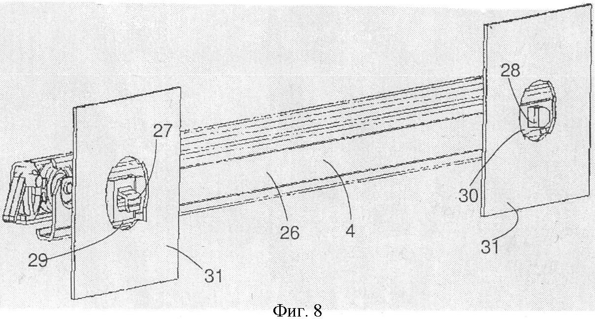 В зафиксированном положении базирующие элементы 32, 33 имеют ориентацию, показанную на фиг.6 или, соответственно, на фиг.7. Чтобы смонтировать стационарную планку 26 на базирующих элементах 32, 33, ее задний крюк 28 сначала проталкивается горизонтально за вертикальную перемычку 34 базирующего элемента 33. Расстояние между отверстиями 29, 30 внутренней стенки 31 должно быть рассчитано таким образом, чтобы, когда стационарная планка 26 на перемычке 34 достигает упора, крюк 27 ложился перед отверстием 35 базирующего элемента 32, причем это отверстие в своей верхней зоне в значительной мере заполнено запорным телом 36.