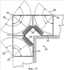 На фиг.14 и 15 показаны пути, в соответствии с которыми три шкафа 31 могут быть объединены с созданием L-образного углового построения. На фиг.14 показано внутреннее угловое построение 36, в котором диагонально противоположные концевые шкафы 31, ориентированные под углом 180° друг к другу, примыкают к центральному шкафу 31, ориентированному под углом 90° по отношению к каждому из концевых шкафов. По существу, в построении в соответствии с фиг.14 добавлен третий шкаф к двум шкафам фиг.12, имеющим общую ось поворота 33. Таким образом, все три шкафа 31 имеют общую центральную ось поворота 33, относительно которой их выдвижные ящики 32 могут поворачиваться индивидуально (при условии наличия промежутка от смежных выдвижных ящиков) или вместе.