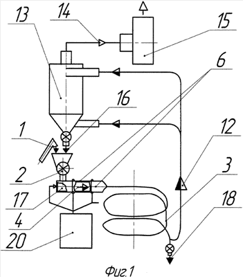 1. Способ подсушки зерна в потоке, включающий непрерывную или периодическую загрузку зерна через питающий дозатор в трубчатую секционную сушильную камеру змеевикового типа, перемещение зернопотока по внутренней полости трубчатой секционной сушильной камеры змеевикового типа сверху вниз с обеспечением дополнительной закрутки всего зернопотока в полостях каждой из секций трубчатой секционной сушильной камеры змеевикового типа высокоскоростными, подъемно-транспортирующими, эжектирующими струями воздуха-теплоносителя по ходу движения зерна в полости трубчатой секционной сушильной камеры змеевикового типа, обеспечение непрерывного влагоотделения с поверхности зерна и удаление паров влаги от потока зерна с подачей их в аппарат пылеуловитель со встречными закрученными потоками, где отделяют влажный воздух и направляют с помощью вентилятора в атмосферу, а уловленные пыль и зерно снова вводят в питающий дозатор, из которого зерно вводят в полость верхнего витка трубчатой секционной сушильной камеры змеевикового типа, обеспечивают выгрузку зерна в тару или бурт, отличающийся тем, что закрутку зернопотока осуществляют в четных секциях трубчатой секционной сушильной камеры змеевикового типа вокруг их осей против часовой стрелки с отклонением от направления движения зернопотока на угол , а в нечетных секциях – по часовой стрелке с отклонением от направления движения зернопотока на угол .