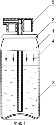 В процессе эвакуации жидкого состава слезоточивого раздражающего действия (фиг.2) сжатый воздух 4 как поршень вытесняет жидкий состав слезоточивого раздражающего действия 3 из баллона 1 через отверстие сифонной трубки, открытый клапан 2 и выходное отверстие устройства с системой каналов 5 для формирования струи жидкости.