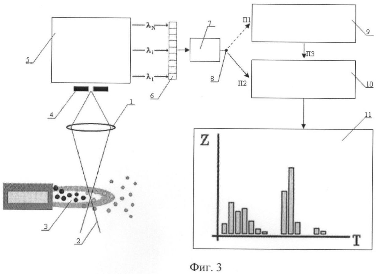 Устройство работает следующим образом. Излучение двухфазного гетерогенного плазменного потока 3, двухфазного плазмотроном и движущегося поперечно относительно заданного сечения 2 (где положение сечения 2 задается положением оптической системы 1 и входной щелью 4 спектрального дисперсионного устройства 5, проходит через оптическую систему 1 и проецируется на входную щель 4 спектрального дисперсионного устройства 5, которое пространственно разделяет прошедшее через входную щель излучение по N длинам волн. Полученное на N длинах волн изображение входной щели проецируется в фокальную плоскость, где находится многоэлементный фотоприемник 6, N фотодиодов которого работают в режиме накопления заряда. На каждом отдельно взятом фотодиоде фотоприемника происходит преобразование падающего излучения в электрический сигнал, и на всех фотодиодах производится параллельное одновременное накопление электрического сигнала в течение времени регистрации tpeг., что позволяет суммировать все мгновенные спектры излучения гетерогенного потока в сечении 2. После времени накопления заряда tpeг схема опроса фотоприемника передает электрические сигналы с фотодиодов на аналого-цифровой преобразователь 7, а он переводит их в цифровую форму. На первом этапе измерений – в режиме «холостого хода» плазмотрона, измеряют спектр излучения плазменного потока без частиц конденсированной фазы в виде вектора значений S(li), S(l2) ,S(li), , S(lN), которые с выхода преобразователя 7 через переключатель режимов 8 поступают на вход П1 блока выделения спектральных линий фона 9, где каждый элемент из вектора значений S(li), S(l2) ,S(li), , S(lN) сравнивают с заранее известным пороговым значением «темнового» сигнала фотоприемника и определяют набор значений номеров k, содержащий номера k1, k2, kM тех длин волн lk, где интенсивность спектральных линий плазмы S(lk) не равна нулю. Полученный набор значений номеров к с выхода блока выделения спектральных линий фона 9 поступает на вход П3 блока цифровой обработки сигналов 10, где из матрицы А исключают соответствующие столбцы и строки с элементами а(li,Tj), где i или j равны одному из значений в наборе k. При этом размер матрицы А уменьшается с N×N до (N-M)×(N-M). На втором этапе измерений – в номинальном режиме работы, (когда в плазменный поток инжектируются частицы конденсированной фазы) измеряют суммарный спектр гетерогенного плазменного потока U, в виде вектора значений U(li), U(l2), ,U(li), U(lN), выходные данные преобразователя 7 через переключатель режимов 8 поступают на вход П2 блока цифровой обработки сигналов 10, где исключают все значения U(lk) на тех длинах волн lk, где интенсивность спектральных линий плазмы S(lk) не равна нулю. При этом размер вектора значений U(li),U(l2), ,U(li), ,U(lN) уменьшается с N элементов до (N-M) элементов. Затем на основе преобразованных значений вектора U’ и матрицы А’ в блоке цифровой обработки сигналов 10 определяют гистограмму Z температурного распределения разнородно нагретых частиц 11 конденсированной фазы двухфазного потока.