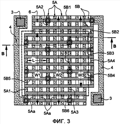 Вторая сетка также состоит из группы проводящих дорожек (5В), которые, по существу, являются прямыми и параллельными друг другу, а также ориентированы под прямым углом к проводящим дорожкам (5А), которые составляют указанную первую сетку. На фиг.3 можно увидеть, что при проекции на плоскость, содержащую мембрану, проводящие дорожки, которые формируют каждую из двух сеток, являются перпендикулярными друг другу.