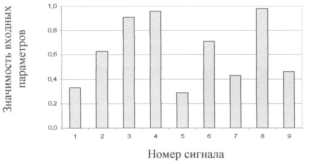 На чертеже представлена оценка значимости входных параметров сети, показывающая, что все 9 входных сигналов являются значимыми и влияют на точность прогноза. Сенсоры разработанной системы характеризуются перекрестной чувствительностью по отношению к ароматобразующим веществам сыворотки. Проранжировать сенсоры по уровню информативности в отношении к тому или иному измеряемому фактору с применением ИНС невозможно. По 9 входным параметрам (отклики массива сенсоров) трехслойная нейронная сеть выдает качественные показатели: титруемая и активная кислотности, показатель преломления, общая бактериальная обсемененность, по которым можно прогнозировать качество творожной сыворотки или продуктов ее фракционирования.