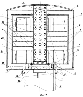 На фиг.2 показана платформа 3 на четырех цилиндрических ножках 12, жестко закрепленная относительно нижнего фланца 9 винтами 13. Вентиляторы 14 для конвекции воздуха в корпусе 7 размещены в верхней и нижней части полой стойки 4. Полая стойка 4 для конвекции воздуха имеет ряд сквозных отверстий 15, которые также проходят через наборные элементы 16 – втулки, надеваемые на стойку 4, которые при необходимости можно заменить на другие с измененной длиной с целью подстройки стереоскопического базиса (расстояния между платформами).