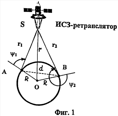 Геометрическая схема расположения наземных пунктов A и B и ИСЗ-ретранслятора S изображена на фиг.1, где введены следующие обозначения: О – центр масс Земли; d – база интерферометра; r – радиус-вектор ИСЗ.