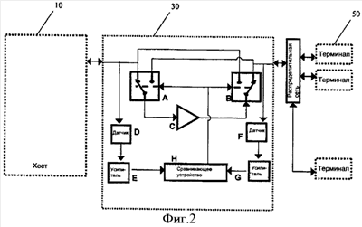 Когда терминал 50 является стороной передачи, переданный терминалом 50 сигнал данных после определения детектором F передается для усиления в усилитель Е. Сравнивающее устройство Н сравнивает выходные напряжения усилителя Е и усилителя G на двух входах сравнивающего устройства Н и подает управляющий сигнал переключения в соответствии с результатом сравнения, так что оба двухпозиционных однополюсных переключателя А и В находятся во втором состоянии (как показано на фиг.3). Таким образом, сигнал данных терминала 50 подается в усилитель С через двухпозиционный однополюсный переключатель А и передается на хост 10 через двухпозиционный однополюсный переключатель В после того, как он был усилен посредством усилителя С.