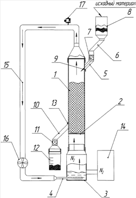 Вентилятор 16 и система рециркуляции газообразного азота 15 служат для создания необходимого для псевдоожижения напора газообразного азота. Клапан 17 предназначен для выравнивания давления в системе.
