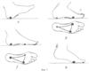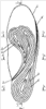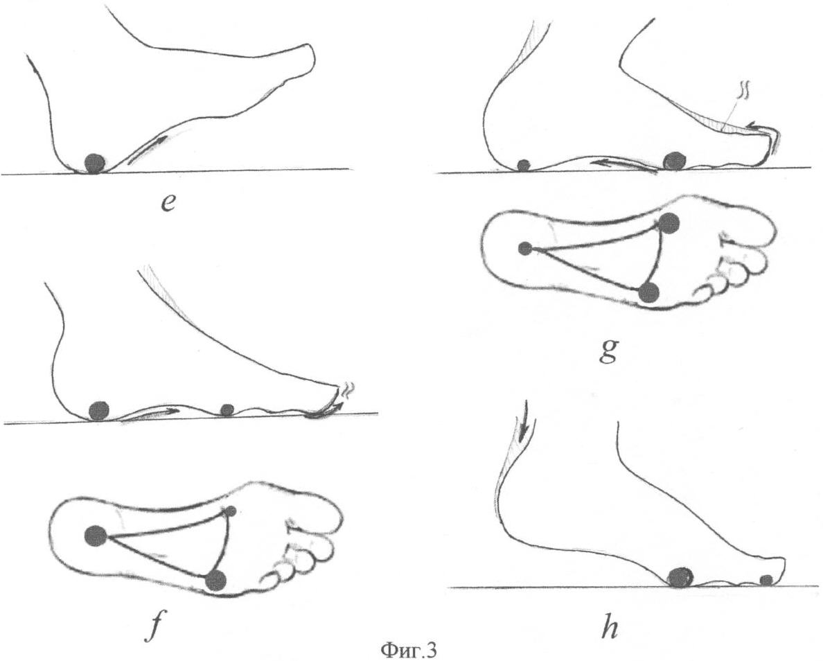 За первой фазой следует следующая фаза переката стопы. Она называется – опора всей стопой и занимает 45% времени всего переката. В это время стопа под действием веса тела оказывается прижатой к опоре (фиг.3, f), а площадь опоры стопы достигает максимума. По мере возрастания нагрузки толчка возрастает и площадь соприкосновения стопы со стелькой. После того, стопа со стороны пятки деформировала группу выступов 2 (фиг.2, b – нижняя), тем самым направив потоки воздуха в носочную часть (фиг.3, е; фиг.1, 6), перекат стопы продолжается. На первом этапе опоры стопа приземляется на наружный отдел пятки, и перекат производится по наружному участку (супинация стопы) (фиг.3, f). Таким образом, стопа продолжает заполнять своей массой поверхность стельки с концентрическим разомкнутым петлеобразным рядом выступов на данном участке, уменьшая объем полостей (фиг.2, b – нижняя) и продвигая потоки воздуха в направлении носочной части, и затем за грань стельки через полость для выхода воздуха 6 (фиг.1, 6), производя вентиляцию плантарной поверхности стопы в подпальцевом участке и между пальцами. Одновременно стопа начинает соприкасаться с группой выступов 4 (фиг.2, с – нижняя), расположенных в носочно-пучковой части стельки. При этом свод стопы постепенно снижается до минимума (пронация стопы). В период этой фазы стопа опирается на 3 точки (фиг.3, g – нижняя): на пяточный бугор и на головки 1-ой и 5-ой плюсневых костей. В этот момент опоры стопа, заполняя поверхность стельки, взаимодействует своими выпуклыми участками с группой выступов 4, сгруппированными двумя концентрическими разомкнутыми петлеобразными рядами в области расположения головок плюсневых костей (фиг.1, 4). Выступы 4 при соприкосновении со стопой образуют полость (фиг.2, с – нижняя). Под действием массы тела стопа со стороны пятки начинает оказывать давление на выступы 4, деформируя их мягкими тканями, уменьшая по высоте и увеличивая по ширине (фиг.2, с – нижняя). Одновременно деформируются и мягкие ткани стопы в области нахождения головок плюсневых костей (фиг.2, с – нижняя). В результате этого выступы и мягкие ткани стопы заполняют своей массой свободное пространство между выступами, образованное канавками 5 (фиг.2, с – нижняя), уменьшая их объем и тем самым продвигая поток воздуха в направлении разомкнутой части выступов. Благодаря петлеобразной форме выступов с разомкнутыми их концами, направленными к внутреннему контуру стельки в область между пяточным закруглением и продольным сводом (фиг.1, 4) и образующими при соприкосновении со стопой замкнутые объемы (фиг.2, с – нижняя), движению воздуха задают направление, определяемое направлением концов выступов, и исключается преждевременный выход воздуха на поверхность стельки. По мере возрастания нагрузки объем полостей уменьшается, возрастает давление и воздух стремится в направлении разомкнутой части петлеобразных выступов в полость для выхода воздуха 7 (фиг.1, 7), производя вентиляцию плантарной поверхности стопы в районе пятки и продольного свода, а рельефность поверхности стельки за счет наличия петлеобразных выступов (фиг.2, с – нижняя) оказывает массажное воздействие, эффективность которого увеличивается благодаря концентрическому расположению выступов (фиг.1, 4), обволакивающих при соприкосновении со стопой выпуклые участки стопы в районе нахож