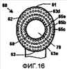Чистящие элементы 64 могут иметь разные конфигурации, как обсуждалось выше, например круглую конфигурацию, как показано на фиг.1. Фиг.16 иллюстрирует пример овальной конфигурации, в которой чистящие элементы 64 расположены во множестве концентрических колец 65a, 65b, 65c, окружающих гнездо 68. Одним из таких колец является неполное кольцо, состоящее из частей 65d, 65e неполного кольца, образованных вдоль верхней и нижней кромок 61, 63 наружной поверхности 62 головки 60, части 65d, 65e которого содержат эквивалент так называемого силового конца, который предназначен для образования чистящей кромки, которая проходит за большую часть поля чистящих элементов для повышения эффективности.