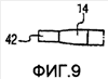 Хотя фиг.1-3 иллюстрируют вспомогательный элемент 16 для ухода за полостью рта в виде зубочистки, могли бы использоваться другие типы вспомогательных элементов 42, как схематически изображено на фиг.9. Как здесь проиллюстрировано, такой вспомогательный элемент 42 устанавливался бы на конце ручки 14 подобно установке зубочистки 16. Такая установка могла бы быть выполнена с возможностью съема или постоянной. Примеры таких вспомогательных элементов для ухода за полостью рта включают очистители для языка, держатели межзубной нити или межзубный ершик. Подобным образом, вспомогательным элементом могли бы быть тампон или губка, подобные чистящему элементу 36 на фиг.6, или могла бы быть единичная масса из материала с шероховатой поверхностью, такой как чистящий элемент 34 на фиг.5.