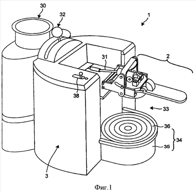 Подробное описание вариантов осуществления настоящего изобретения На фиг.1 приведен в пространстве предпочтительный вариант выполнения распределителя напитка или распределяющего устройства 1, которое содержит устройство приготовления напитка или модуль 2 в соответствии с настоящим изобретением. Это устройство будет описано подробно далее. Оно присоединено к раме 3 машины, которая содержит систему подачи воды, по существу, известную, служащую для подачи в устройство воды под давлением и содержащую емкость с водой 30, такую как прозрачная банка, насос и нагреватель воды (не виден) внутри рамы, впускную трубку 31, присоединяющую насос и нагреватель воды к устройству 2. Управление впуском воды в устройство производят с помощью системы привода 32, содержащей, по существу, известный клапан и ручной рычаг привода. Могут быть использованы иные системы привода, такие как кнопка остановки, соединенная с электромеханическим клапаном. Основное средство 38 управления электропитанием расположено на раме и используется для включения машины и, например, для начала, при необходимости, предварительного нагревания объема воды с помощью нагревателя.