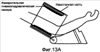 Фиг. 13A – схематичное изображение фиксации манжеты в традиционном измерителе артериального давления, имеющем конфигурацию, в которой две пневмогидравлических камеры, независимо обеспеченных через посредство скручивающейся спирали, служат как для наложения манжеты, так и для измерения артериального давления.
