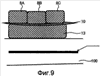 Фиг. 9 – изображение конфигурации сжимающей и фиксирующей пневматической камеры 8 измерителя 1 артериального давления в соответствии с третьим вариантом осуществления и взаимного относительного расположения сжимающей и фиксирующей пневматической камеры 8, скручивающейся части 10, измерительной пневматической камеры 13 и плеча.