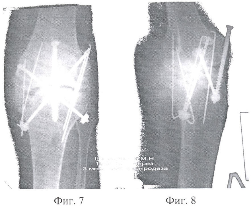 Фиг.7 – Контрольная рентгенограмма коленного сустава после артродеза заявленным способом (с двух сторон сустава) и остеосинтеза трансплантатов спицами в прямой проекции.