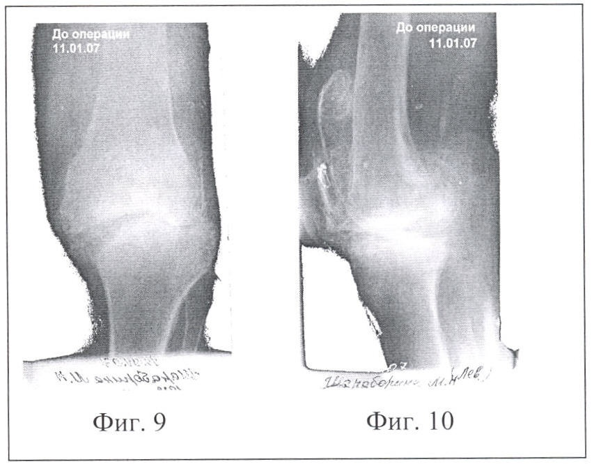 Способ оперативного вмешательства осуществляется следующим образом. До операции планируется диаметр фрезы, который должен быть не менее половины ширины суставной щели со стороны оперативного вмешательства, при этом большая часть трансплантата планируется выпиливать со стороны суставной поверхности, имеющей меньший дефект. На фиг.9 и 10 меньший дефект имеет мыщелок бедренной кости. Больной укладывается на операционном столе. Обрабатываются кожные покровы, как перед операцией. На конечность накладывается жгут с целью обескровливания операционного поля. Производится послойный доступ к суставу (ложному суставу). При необходимости производится коррекция вальгусной или варусной деформации сустава с временным фиксированием его спицами. Место для введения цилиндрической фрезы особо не готовится, т.е. не иссекаются связки, рубцы и надкостница. Цилиндрической фрезой выпиливается на заранее запланированную (фиг.1, фиг.2) глубину два разновеликих трансплантата (больший трансплантат берется из менее травмированной кости, имеющей меньший дефект). Оба трансплантата извлекаются или сразу же разворачиваются в образовавшемся туннеле так, чтобы полностью заполнился дефект в кости и перекрыл зону ложного сустава. Импактором по торцу введенных трансплантатов наносятся удары (трансплантаты вбиваются) с целью слегка расширить их («смять», чтобы они плотно сели на место) и сразу же производится остеосинтез каждого трансплантата спицей или винтами, или же винтом обоих трансплантатов с одновременным фиксированием сустава (фиг.5). Вслед за трансплантатами укладываются оставшиеся костные фрагменты или они вбиваются между трансплантатами (если они есть, например, срубленные остеофиты) и рана послойно зашивается до дренажа. Затем производится дополнительная иммобилизация гипсовой повязкой на срок до трех месяцев в зависимости от анатомической области оперативного вмешательства.