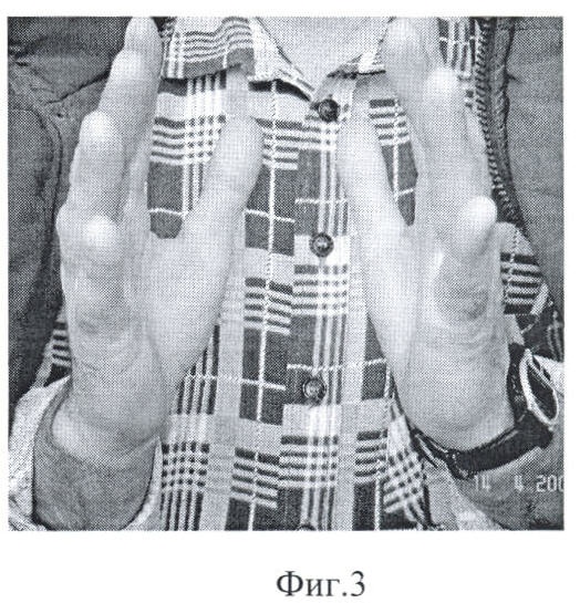 3.04.07 выполена операция: апоневрэктомия правой кисти. На плановом осмотре 30.01.08 контрактура полностью устранена, активные и пассивные движения в суставах пальцев сохранены в полном объеме, сила кисти сохранена, нейровазальных расстройств правой кисти нет, функция кисти полностью восстановлена (фиг. 3).