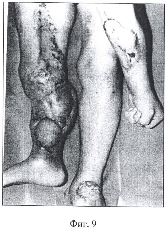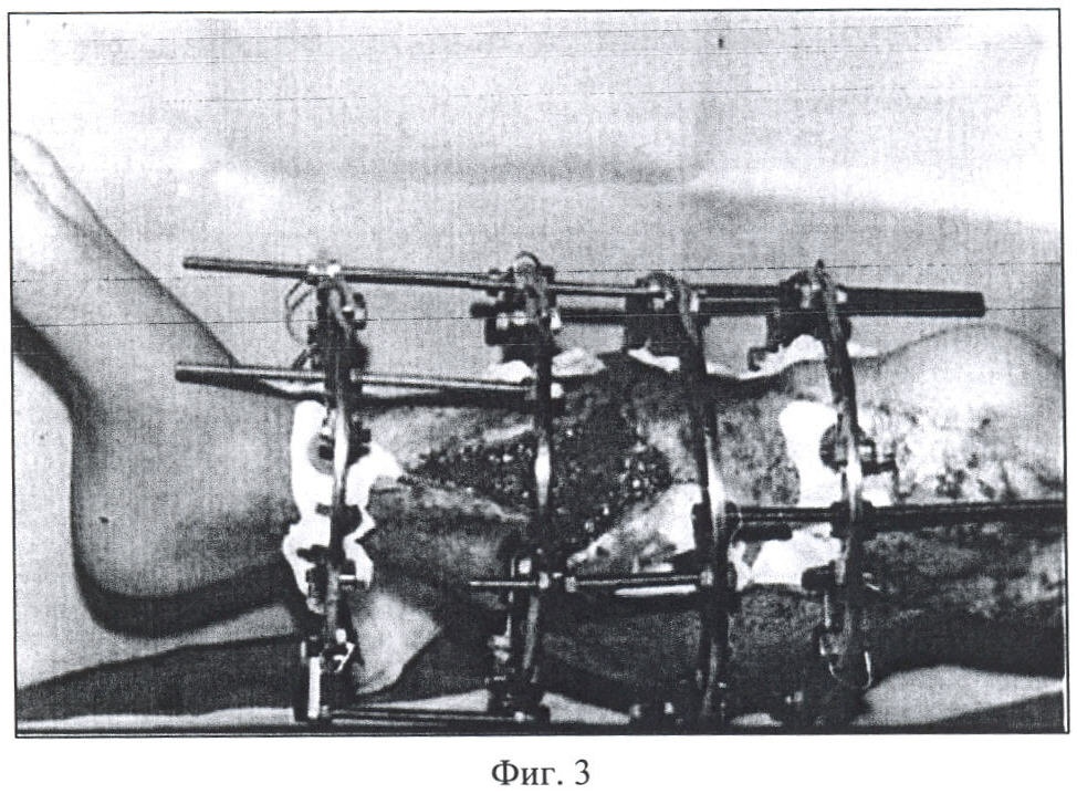Клинический пример. Больной С., 19 лет, поступил в военный госпиталь 01.04.90 г. по поводу: «Последствия открытого перелома, оперативных вмешательств костей правой голени, осложненных остеомиелитом, дефектом обеих костей (6 см) и вазотрофической язвой (10×15 см) на передневнутренней поверхности голени» (фиг.3).