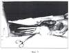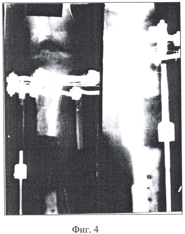 01.04.90 г. произведена операция: секвестрнекрэктомия с резекцией выстоящих в рану концов большеберцовой кости и фиксацией их КДА Г.А.Илизарова (фиг.4). Последующее лечение в течение пяти месяцев трофической язвы традиционными методами пересадки кожи к заживлению ее не привело.
