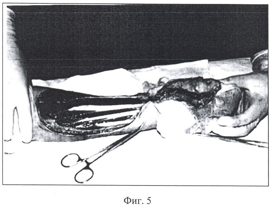 Вторым этапом были взяты лучевой кожно-фасциальный лоскут размером 11×15 см с левого предплечья (фиг.5) и несвободный кровоснабжаемый тыльный лоскут левой стопы размером 8×10 см, с учетом его анатомических особенностей. Между магистральными сосудами комплексов тканей (тыльным и лучевым) было выполнено микроанастомозирование сосудистых ножек.