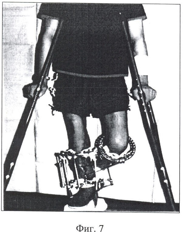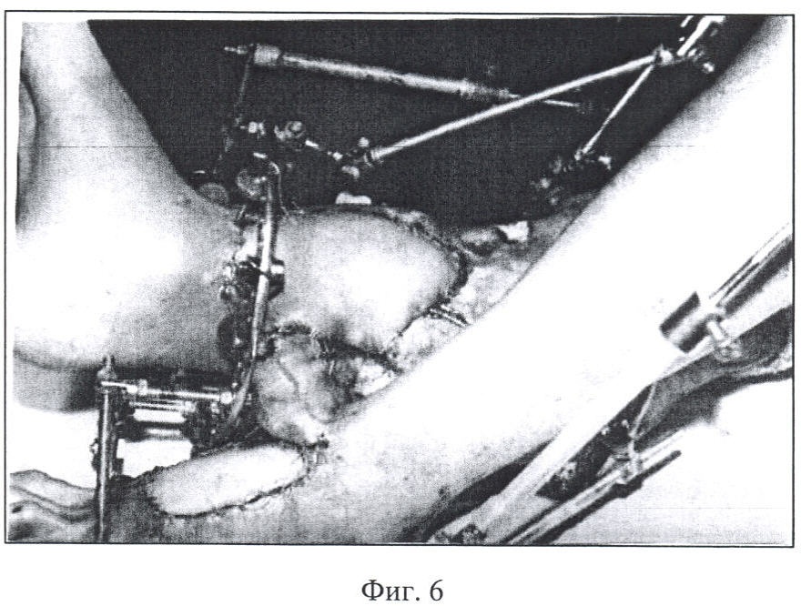 Третьим этапом было наложение КДА Г.А.Илизарова на обе голени и жесткое их соединение между собой в единый блок с надежной фиксацией в них обеих конечностей с учетом длины сосудистой ножки тыльного лоскута стопы, после чего лучевой лоскут подшит на реципиентное ложе на правой голени (фиг.6). Донорские области закрыты свободными расщепленными кожными трансплантатами с наружной поверхности левого бедра. Продолжительность операции составила 8 часов и выполнена одной бригадой хирургов.