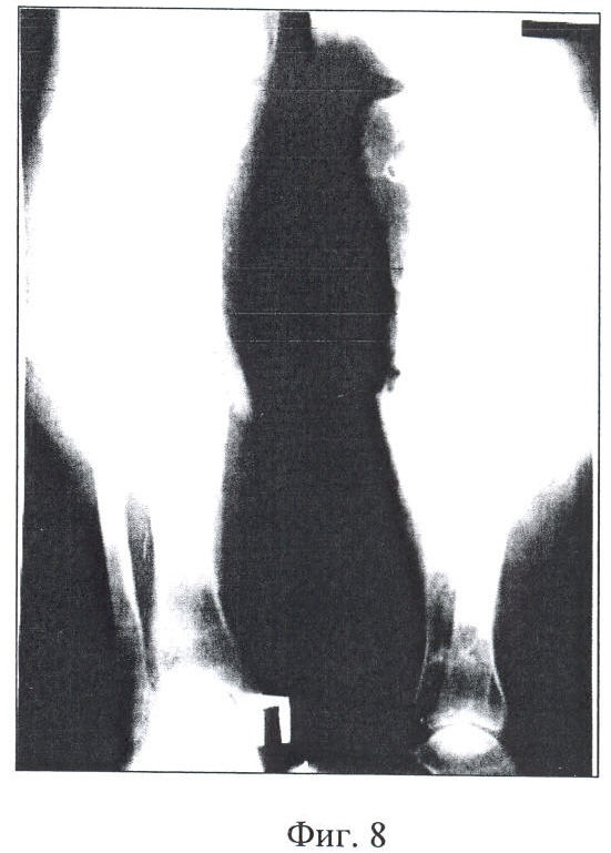 19.12.90 г. после проведенной клинической пробы и рентгенологического контроля был снят КДА Г.А.Илизарова с правой голени, так как наступило сращение перелома костей (фиг.8).