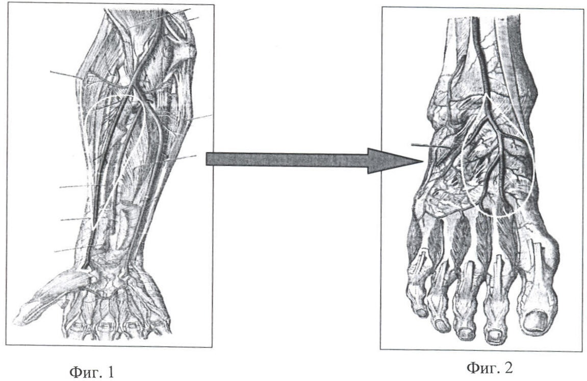 2) защитить от воздействий факторов внешней среды (высыхания, инфицирования) сосудистую ножку лучевого аутотрансплантата и предупредить его некроз тыльным лоскутом стопы;