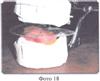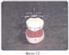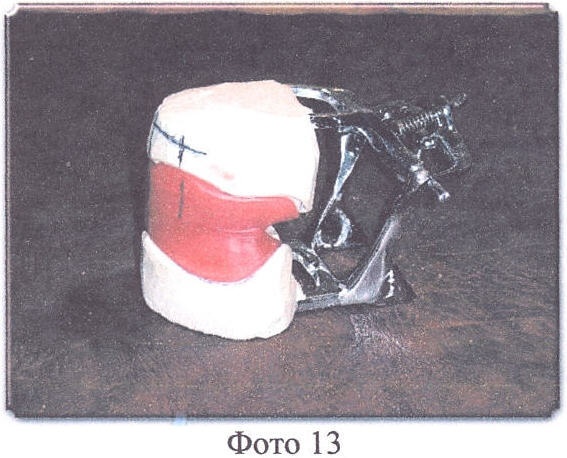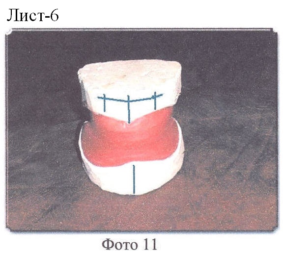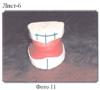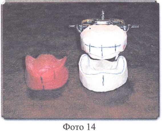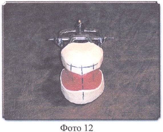 Способ изготовления миодинамического мягкого полного съемного протеза рассматривается с поступления в зуботехническую лабораторию моделей верхней и нижней челюстей и прикусных шаблонов, после определения центральной окклюзии врачом (Фото 11). Модели фиксируются (гипсуются) в окклюдатор (Фото 12, 13) или артикулятор, подбираются размер, цвет и форма искусственных зубов, на моделях размечаются границы будущих протезов и наносится центральная линия по альвеолярным отросткам в обычном порядке.