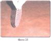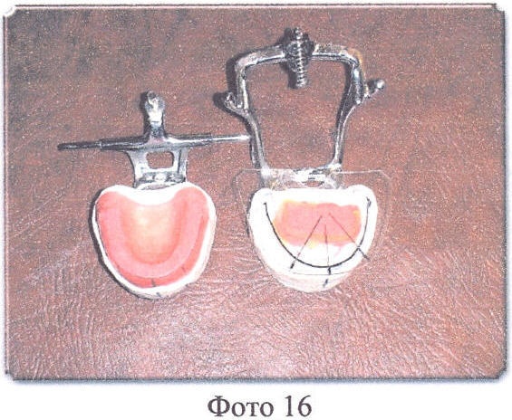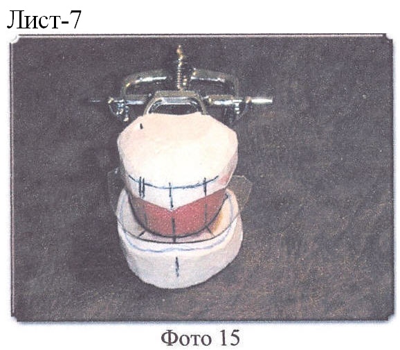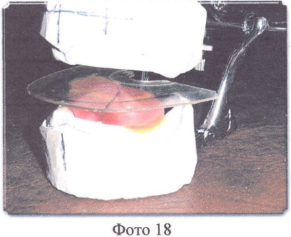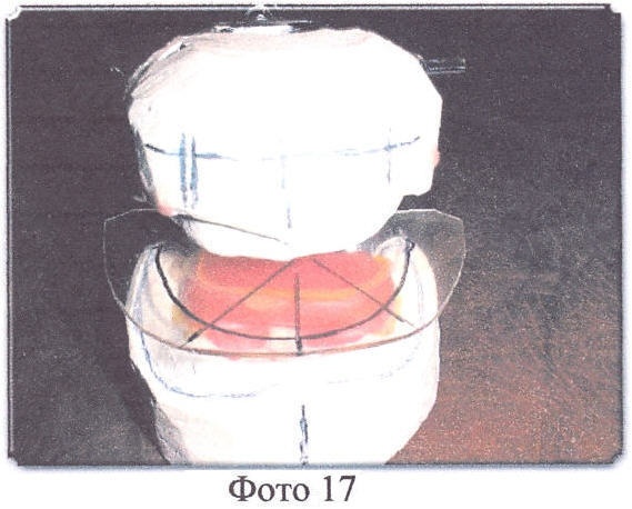 Врач при определении центральной окклюзии формирует верхний прикусной шаблон, учитывая максимально все особенности данного пациента, а именно отмечает на шаблоне центральную линию, линии клыков, линию высоты улыбки, формирует нижнию плоскость верхнего шаблона (прилегающую к нижнему шаблону) так, чтобы нижний край шаблона соответствовал по уровню режущему краю центральных резцов и клыков, был параллелен глазной линии, а вестибулярная плоскость шаблона, вставленного в рот пациента, придавала лицу нормальный вид, без ощущения дискомфорта (например, смыкание губ без видимого напряжения) и т.д. Далее шаблоны снимаются с моделей (Фото 14). Верхний шаблон ставится обратно на верхнюю модель, на нижнюю модель по центру (в области языка) ставится мягкий восковой валик (диаметром 3-6 см), сверху накладывается тонкая (0,5-1 мм) пластинка (можно из оргстекла), окклюдатор (артикулятор) смыкают, пластинку липким воском приклеивают к валику, который установлен на нижнюю модель (окклюдатор в сомкнутом состоянии, а восковой валик затвердел (остыл)). Потом на пластинке отмечают, ориентируясь по верхнему шаблону, центральную линию (на котором нужные отметки сделаны врачом), линии клыков, вестибулярную линию (дугу) по наружному нижнему краю шаблона. Верхний шаблон снимается (Фото 14-18). Делаются отметки вокруг валика, на котором закреплена пластинка, чтобы в дальнейшем можно было его установить на свое место. Приготовленную таким образом постановочную пластинку снимают с нижней модели вместе с приклеенным к ней восковым валиком.