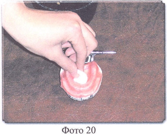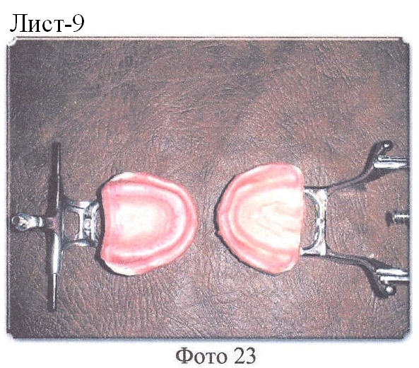 Далее на верхнюю, потом на нижнюю модели накладывают пластинку бюгельного воска (толщина 0,5 мм), предварительно разогретую в теплой воде до эластичного состояния, и тщательно обжимают ее мягким тампоном по всей поверхности протезного поля модели. Затем повторяют операцию и накладывают сверху на первую пластинку вторую, также на верхнюю и нижнюю модель (Фото 19-23).