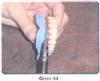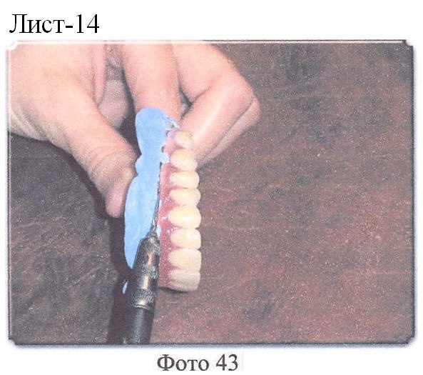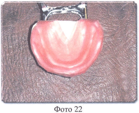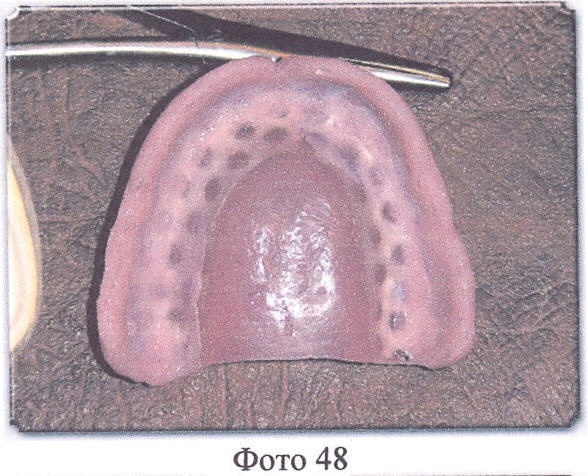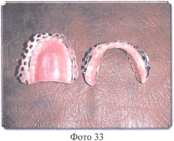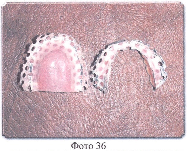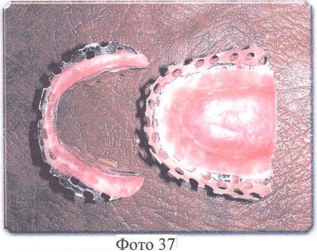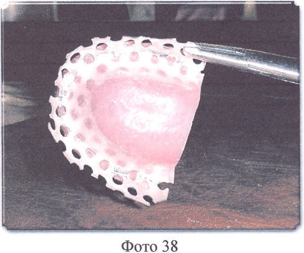 Далее все операции осуществляются в обычном порядке, после окончания полимеризации кюветы должны медленно остыть до комнатной температуры, их открывают, извлекают протезы, протезы отделывают, шлифуют и полируют, причем края перфорированного твердого базиса должны быть чистыми, без остатков гипса и т.д., край твердого базиса (красная акриловая пластмасса), граничащий с перфорированным твердым базисом, пришлифовывают под углом в 45% к перфорированному твердому базису (Фото 36, 37, 38).