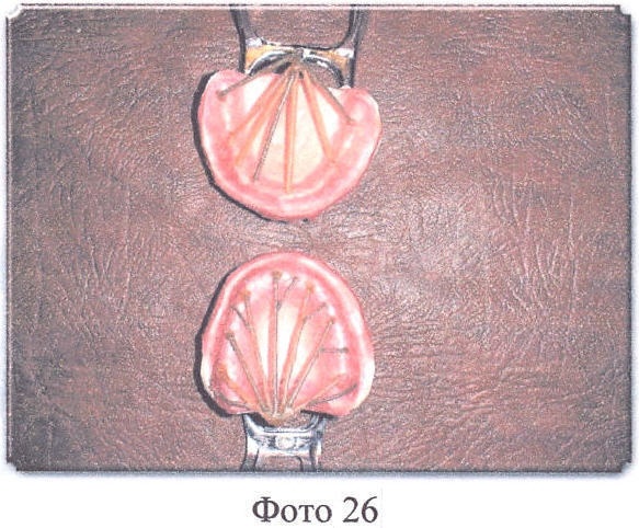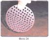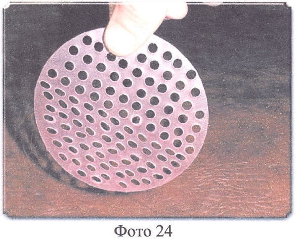 Потом моделируют перфорированный твердый базис: берут перфорированную пластинку бюгельного воска (толщина 0,5 мм), поскольку промышленность не выпускает перфорированный бюгельный воск, то мы сами равномерно на всю плоскость бюгельного воска (толщина 0,5 мм) наносим отверстия диаметром до 5-6 мм (Фото 24, 25). Далее на верхнюю, потом на нижнюю модели накладываем пластинку перфорированного бюгельного воска (толщина 0,5 мм), предварительно разогретую в теплой воде до эластичного состояния, и тщательно обжимаем ее мягким тампоном по всей поверхности (сверху двух предыдущих слоев).