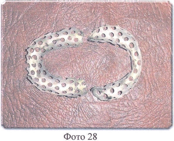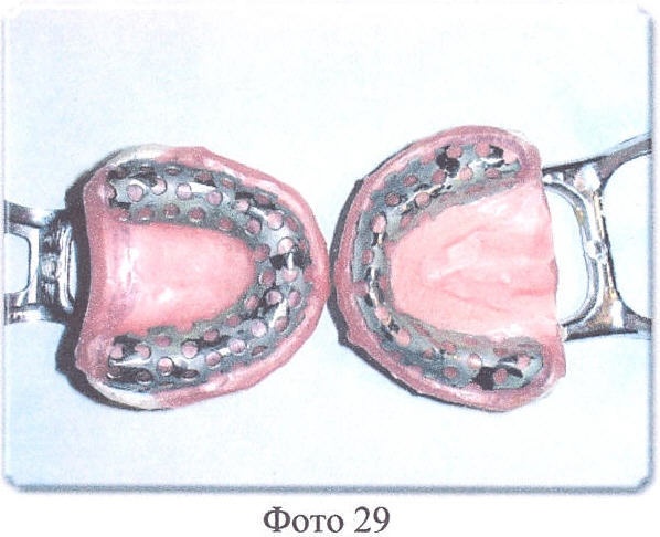 Затем, получив перфорированный твердый базис, отлитый из металла (верхний и нижний), он отделывается, срезаются литники, шлифуется (покрывается, если есть необходимость нитритом титана, золотом и т.д.) и проверяется правильность его посадки на модели (Фото 28, 29).