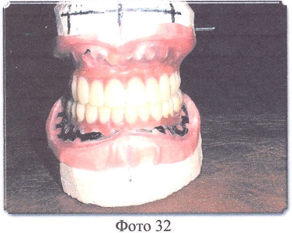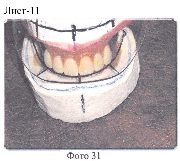 Боковые резцы устанавливаются также по отмеченной дуге на постановочной пластинке, но на 0,5 мм выше постановочной пластинки. Режущими бугорками клыки также касаются постановочной пластинки, причем режущий бугорок должен совпадать с отмеченной линией клыков на постановочной пластинке и отмеченной дугой, а сами клыки (зубы) образуют поворотные пункты зубной дуги (Фото 31). Далее остальные зубы устанавливают в обычном порядке.