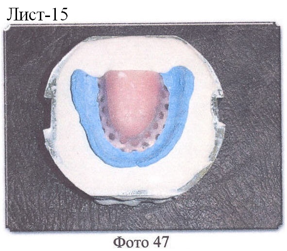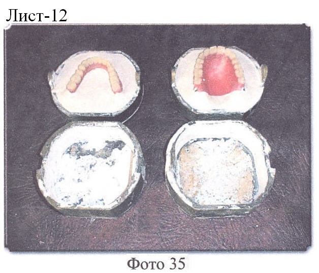 Далее все операции проводятся в обычном порядке. Кювета собирается, гипс в первой части изолируется, гипсуется (формуется) вторая часть кюветы, удаляется воск, гипс внутри кювет обрабатывается изолирующим лаком, проводятся формовка пластмассы и полимеризация.