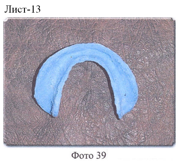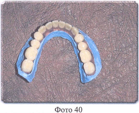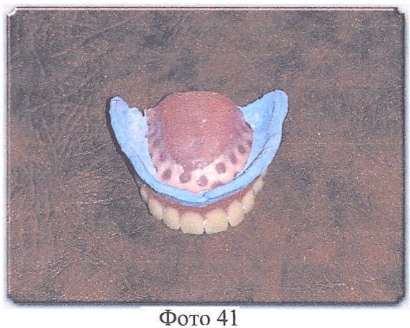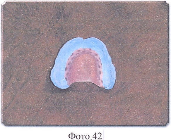 Врач берет, например, силиконовую оттискную массу конденсационного типа STOMAFLEX CRÈME фирмы SpofaDental, согласно приложенной инструкции производится применение данного материала, т.е. материал замешивается и наносится на внутреннюю и внешнюю части перфорированного твердого базиса верхнего и нижнего протезов в достаточном количестве, тонким слоем в 1-1,5 мм, оба протеза вводятся в полость рта пациента. Пациент закрывает рот в положении центральной окклюзии, фиксирует это положение 1-1,5 минуты, затем в течение 5-6 минут пациент воспроизводит жевательные и глотательные движения. Затем протезы извлекаются и передаются в техническую лабораторию (Фото 39-42).