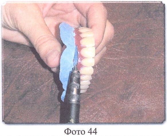 Далее зубной техник аккуратно обрезает излишки массы, попавшие на твердый базис, а по границе твердого базиса и слепочной массы приливается тонкая полоска контрастного воска и зачищается (выравнивается с общей поверхностью) (Фото 43-46).