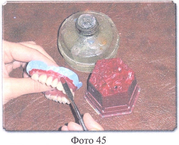 Далее на небную поверхность композиции верхнего протеза накладываем пластинку бюгельного воска (толщина 0,5 мм), предварительно разогретую в теплой воде до эластичного состояния, и тщательно обжимаем мягким тампоном по всей поверхности (твердого неба) протеза до искусственных зубов, излишки обрезаем, небную часть протеза тщательно выравниваем, моделируем и заглаживаем (обычным порядком).