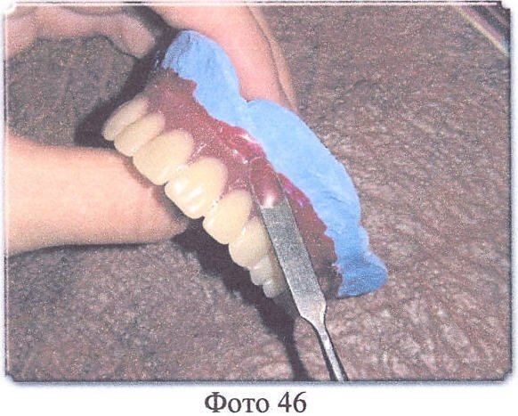 Далее, отступив от шеек искусственных зубов на 5-7 мм, обрезаем и удаляем весь лишний воск с перфорированного твердого базиса с вестибулярной и оральной сторон на композиции протеза нижней челюсти (нижней модели).